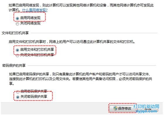 1.4 選擇“啟用網(wǎng)絡(luò)發(fā)現(xiàn)”“啟用文件和打印機(jī)共享”“關(guān)閉密碼保護(hù)共享”,點(diǎn)擊“保存修改”完成設(shè)置,如圖(4);