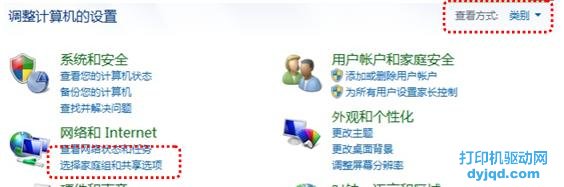 1.2 右上角查看方式選擇“類別”,在“網(wǎng)絡(luò)和Internet”中“選擇家庭組和共享選項(xiàng)”,如圖(2);