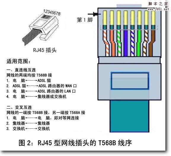3、RJ45網(wǎng)絡(luò)接頭做法一般有568A和568B兩種標準做法,按同一標準即直通線,不同標準即交叉線。