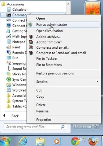 6. 用管理員模式打開(kāi)運(yùn)行命令窗口,位于開(kāi)始-所有程序-附件,右鍵選擇“以管理員身份運(yùn)行”。