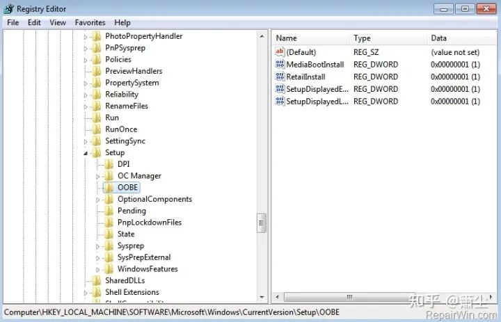 “HKEY_LOCAL_MACHINE/Software/Microsoft/Windows/CurrentVersion/Setup/OOBE”