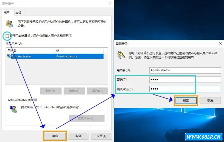 2.選擇要自動(dòng)登錄的賬戶(這里選擇的用戶是 Administrator,每個(gè)人的計(jì)算機(jī)用戶可能會(huì)不一樣,選擇自己需要自動(dòng)登錄的用戶名)取消勾選要使用本計(jì)算機(jī),用戶必須輸入用戶名和密碼。 點(diǎn)確定 后彈出 [自動(dòng)登錄] 對話框,在密碼+確認(rèn)密碼那里輸入登錄密碼(這里的登錄密碼就是自己設(shè)置的 Windows用戶登錄密碼)后點(diǎn)確定 ,重啟電腦就會(huì)自動(dòng)登錄#Win10的用戶一般不是Administrator,一般為用戶自己取的用戶名