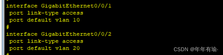 進(jìn)入g/0/0/1端口,配置接口模式為access,允許vlan10的流量通過,進(jìn)入g/0/0/2端口,配置接口模式為access,允許vlan20的流量通過。