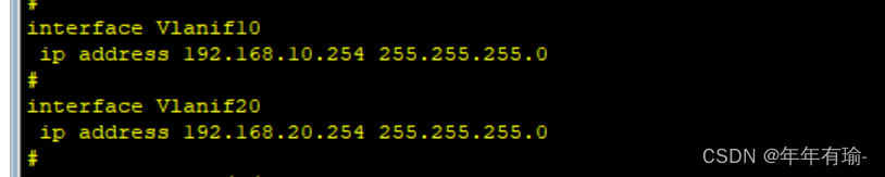 進(jìn)入vlan虛擬接口,配置相應(yīng)的地址(地址為pc的網(wǎng)關(guān),虛擬子接口編號為已創(chuàng)建的vlan編號)