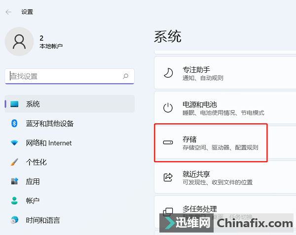 3、來到設(shè)置窗口后,確保左側(cè)選中系統(tǒng),然后在右側(cè)找到【存儲】,點擊進入。