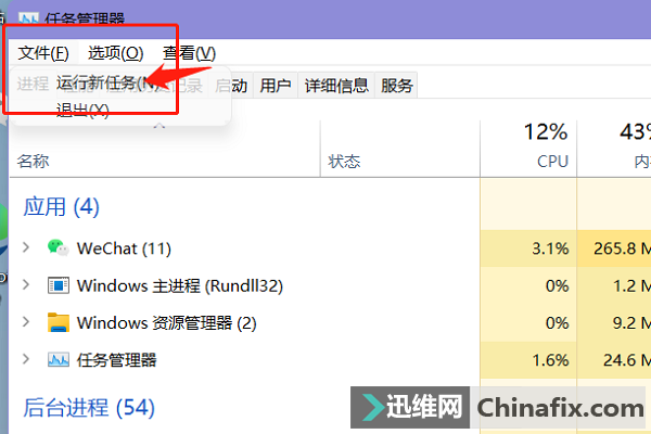 3、左上方點(diǎn)擊【文件】后展開(kāi)選項(xiàng)欄,從中選擇【運(yùn)行新任務(wù)】。