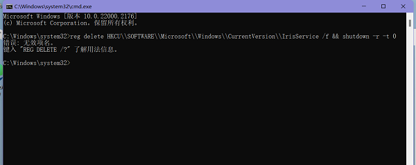 5、粘貼以下命令并按下回車(chē)鍵以運(yùn)行它:reg delete HKCU\\SOFTWARE\\Microsoft\\Windows\\CurrentVersion\\IrisService /f && shutdown -r -t 0電腦重新啟動(dòng)后恢復(fù)正常,原理就是卸載最近更新的一個(gè)補(bǔ)丁。