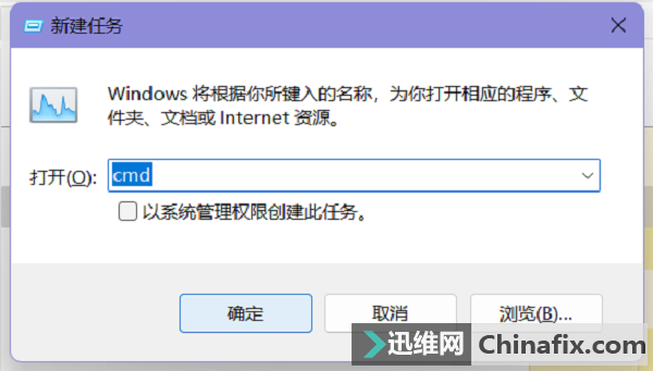 4、在新建任務(wù)窗口,輸入欄里輸入“cmd”接著按下回車(chē)鍵或者點(diǎn)擊下方【確定】。