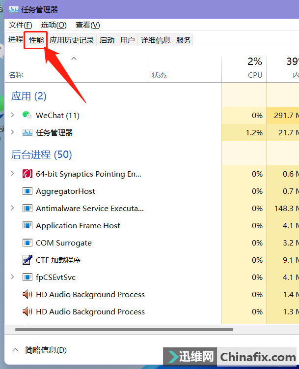 2、打開任務管理器后,我們點擊頂部的【性能】,進入性能界面。