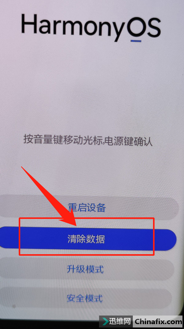 2、通過按音量上下鍵,選擇清除數(shù)據(jù),按電源鍵確認(rèn)(部分機(jī)型支持Recovery模式下觸屏操作,可以通過觸屏點(diǎn)擊進(jìn)行選擇操作)