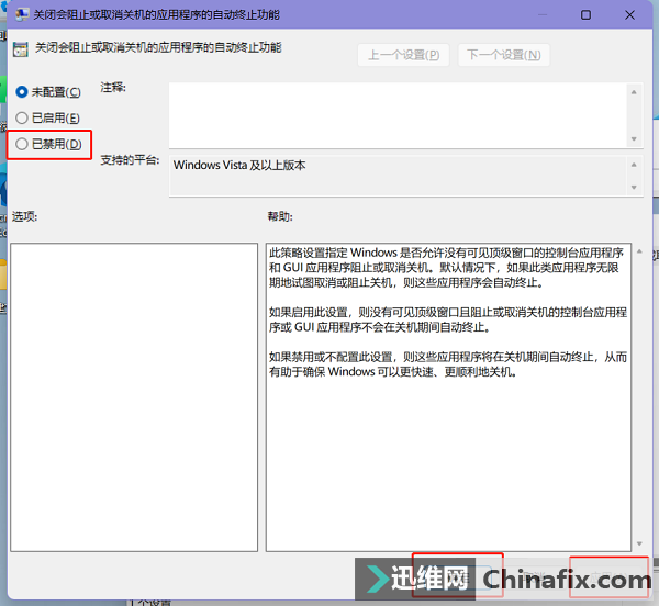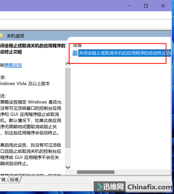 3、接著我們就能在右側(cè)窗口配置欄當中看見【關閉會阻止或取消關機的應用程序的自動終止功能】,點擊打開;