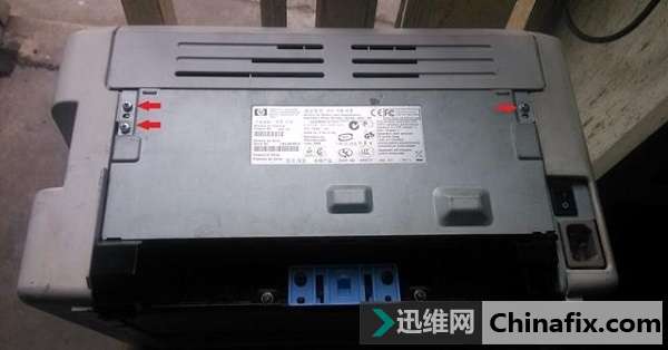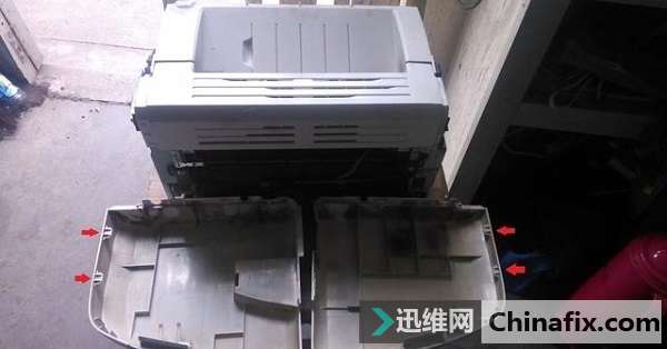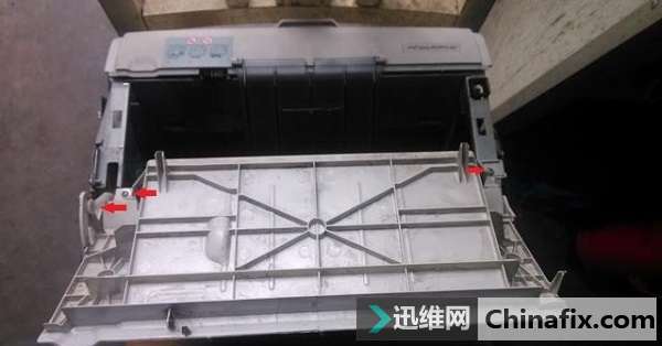 把打印機(jī)翻轉(zhuǎn),拆掉紅色箭頭處的3個(gè)螺絲。