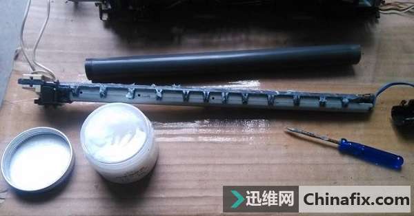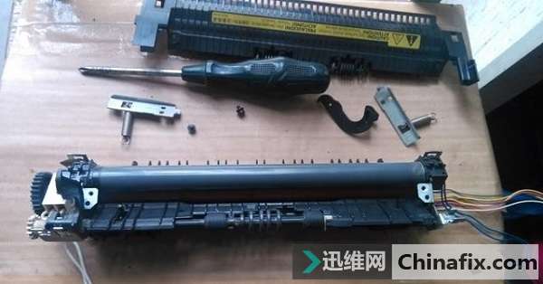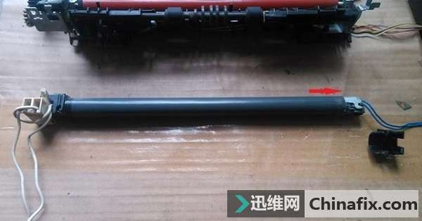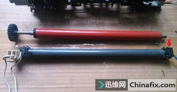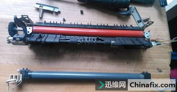 拆出加熱輥。用手轉(zhuǎn)動(dòng)定影膜,發(fā)現(xiàn)轉(zhuǎn)不動(dòng)。里面沒有潤(rùn)滑脂了。