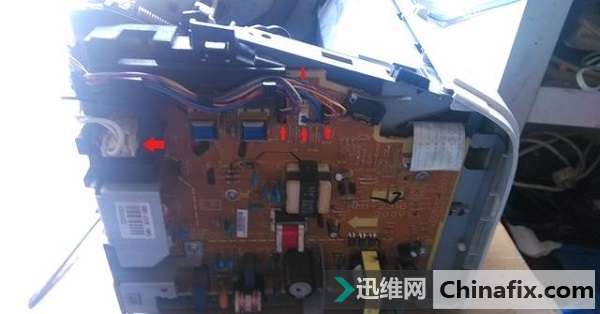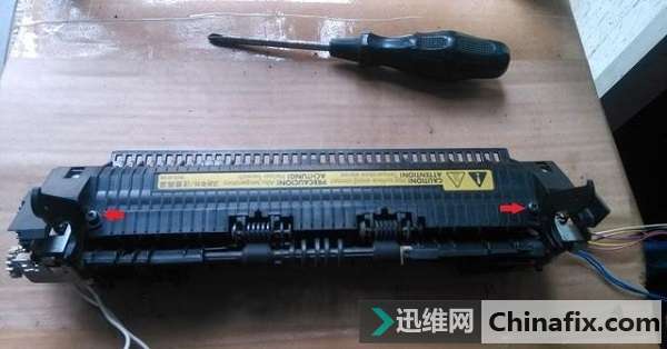 再拆掉箭頭所指的一根紅色粗線,把定影組件上的3個(gè)固定螺絲拆掉。在箭頭處。