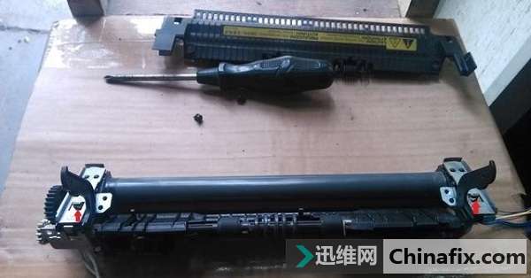 拆出定影輥,發(fā)現(xiàn)齒輪橡皮圈沒有壞,把它再安裝回去。把箭頭處的塑料塊拆下,左右搖晃往外拔就可以了。