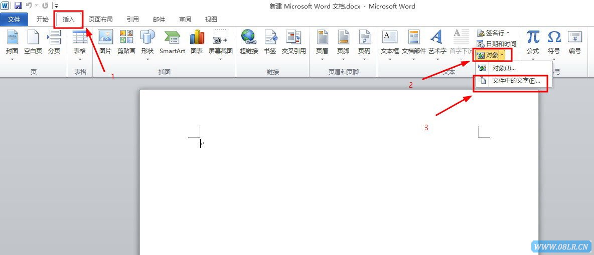 一、打開一個空白文檔,或者你想指定的一個文檔,然后點擊【插入】選項卡,在【文本】選項組中點擊【對象】選擇【文件中的文字】。