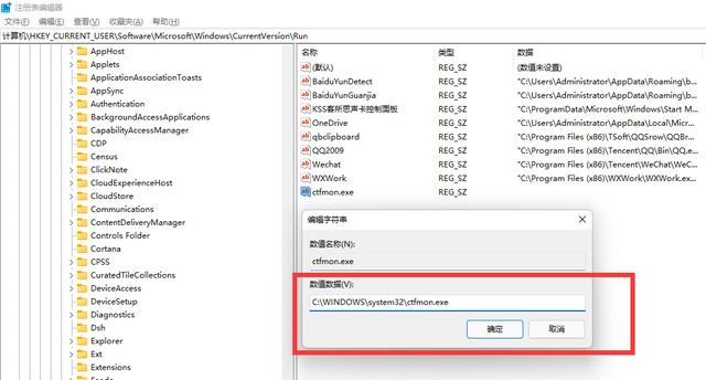 3.在Run層級(jí)中的右側(cè),找到“ctfmon.exe”鍵值,雙擊彈出編輯窗口,將其值設(shè)置為“C:\WINDOWS\system32\ctfmon.exe”然后點(diǎn)擊確定。