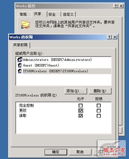 即便是超級用戶,也可以設置其權(quán)限。例如,我們共享“學習資料”這個文件夾,設置為Guest用戶可以讀取,設置IT168Wireless用戶可以更改和讀取,而超級用戶Administrator設置為完全控制。首先刪除everyone用戶組,再一一設置每個用戶的具體權(quán)限。