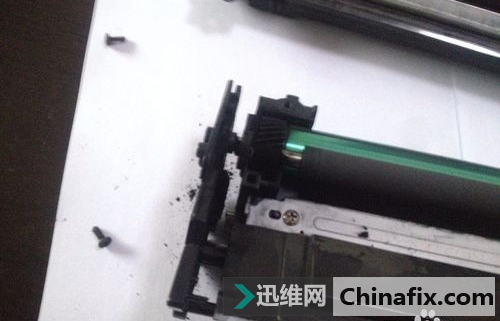 第三步,將硒鼓的左右兩邊的蓋板上的螺絲全部擰出,取下左右蓋板。