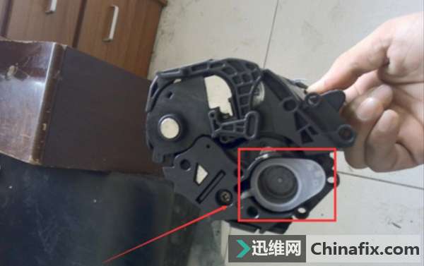 3、取出碳粉盒以后、先用小刀打開這個蓋子、把殘留的費碳粉清理出去。