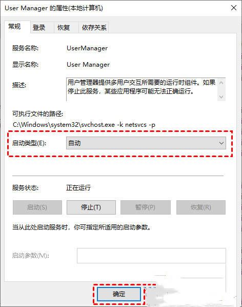 4、在彈出的User Manager屬性窗口,將“啟動類型”設(shè)置為“自動”,再單擊“確定”。