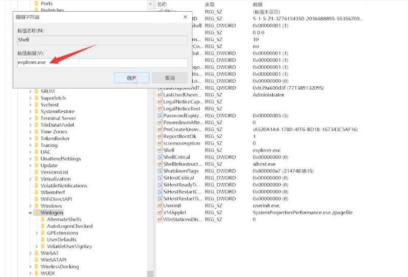 4.將數(shù)值數(shù)據(jù)改為explorer.exe,點擊確定,再重啟電腦即可恢復(fù)正常