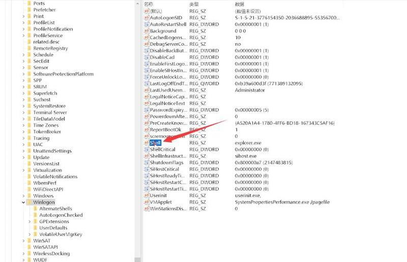 3.選中Winlogon,在右側(cè)找到Shell,并雙擊它打開編輯字符串