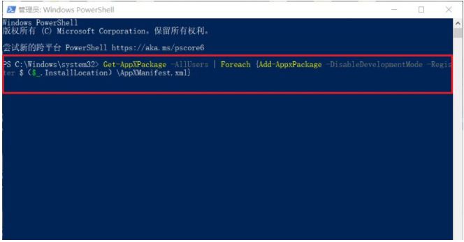 2、輸入并執(zhí)行以下代碼【Get-AppXPackage -AllUsers | Foreach {Add-AppxPackage -DisableDevelopmentMode -Register “$($_.InstallLocation)\AppXManifest.xml”}】。