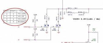 再看看那個(gè)V1.0的圖,看到反饋后面那里還連接兩個(gè)場管,接兩個(gè)信號(hào),這兩個(gè)信號(hào)的電平組合可以調(diào)節(jié)內(nèi)存電壓輸出!