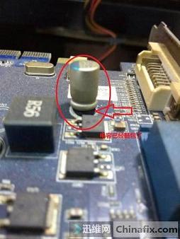 拿起顯卡目測一遍發(fā)現(xiàn)散熱器下有一個470uF 電容已經(jīng)鼓包了,如圖下: